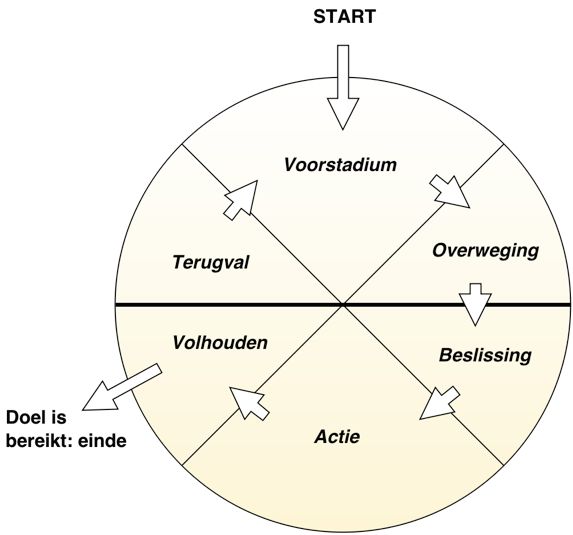 Hoe bewust zijn onze patiënten daarvan en zijn ze al toe aan die stap? Het model van Prochaska en DiClemente laat zien dat mensen bij een verandering vaak een aantal fasen doorlopen en dat het normaal is om tussentijds een aantal keer uit te vallen of terug te vallen. Moeten we in onze meetcultuur soms tevreden zijn met mensen helpen opnieuw in een proces te stappen en ze, als het lukt, een stapje verder brengen.